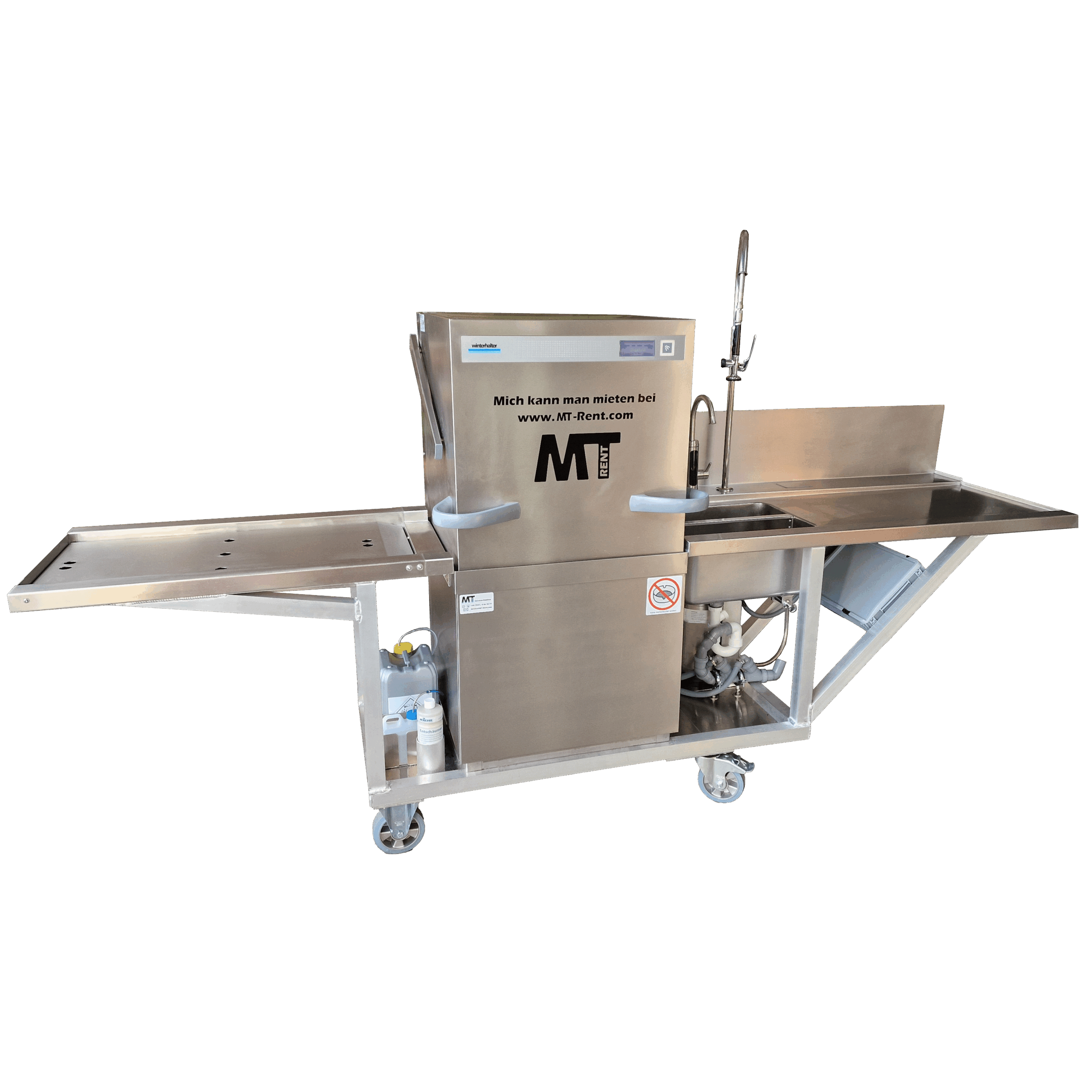 Durchsatzstarke Durchschub-Spülmaschine mit Zulauf- und Entnahmetisch. Einfach auf- und abgebaut durch rollbares Komplettsystem.